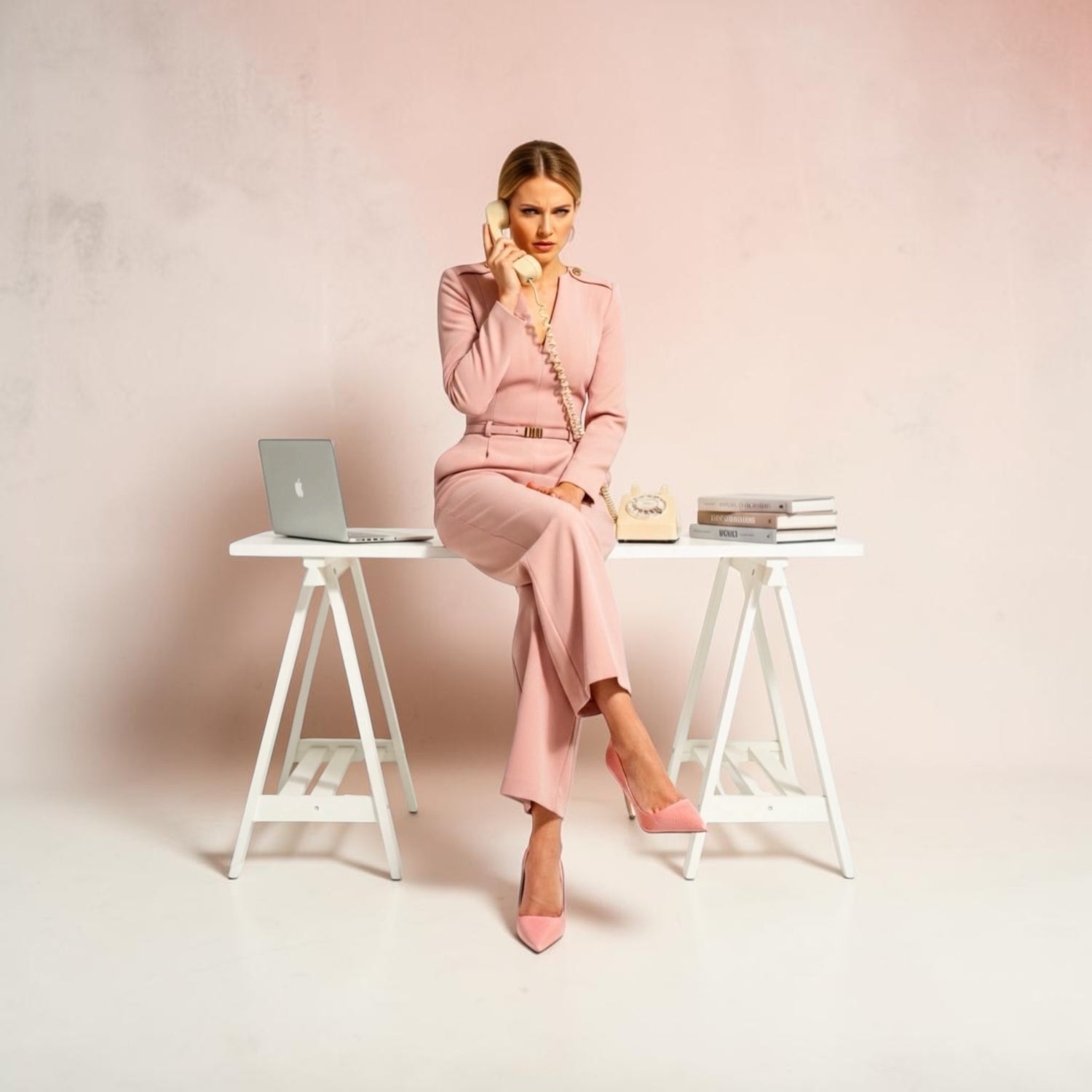 Styled with a tailored pink suit for a polished, modern look. Designed for boss lady moments.