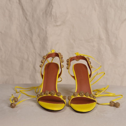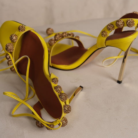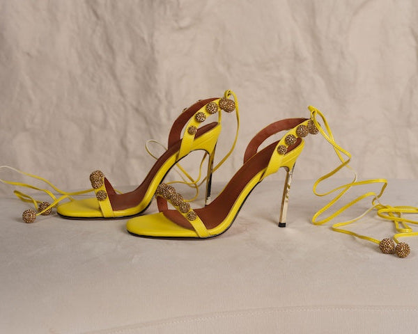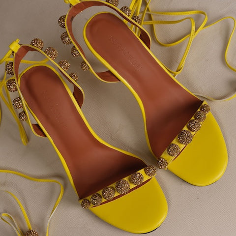 Bellaria is bold yet breezy, a radiant summer statement crafted in vibrant yellow satin and crowned with golden orbs that glisten like sun-kissed jewels. With delicate wraparound straps and an open-toe silhouette, Bellaria strikes the perfect balance between flirtation and finesse, making it as unforgettable as the women who wear it.