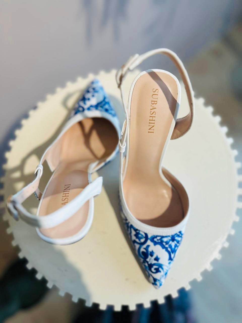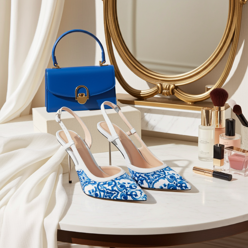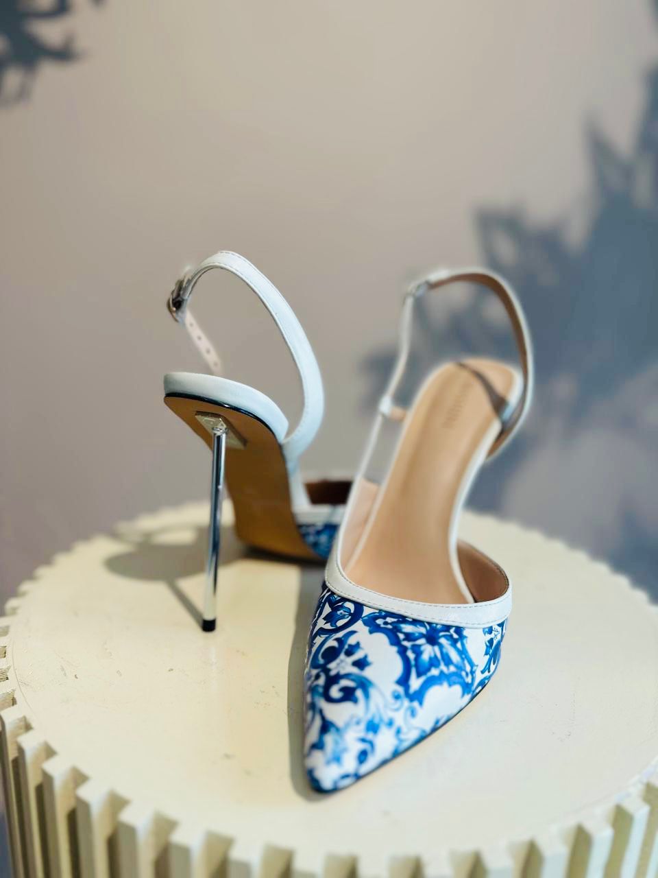 Luna Velluto is a love letter to timeless beauty, where art meets elegance. Wrapped in a ceramic-inspired blue and white motif, this slingback heel evokes sun-drenched terraces and coastal escapes. The pointed-toe silhouette elongates the leg, while the delicate ankle strap adds both femininity and security.